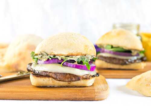 This Portabella Mushroom Burger with Pesto Mayo and Arugula boasts a juicy portabella mushroom which is marinated to enhance its meaty flavor, along with melted provolone cheese and the bold flavors of pesto mayo, red onion and arugula!