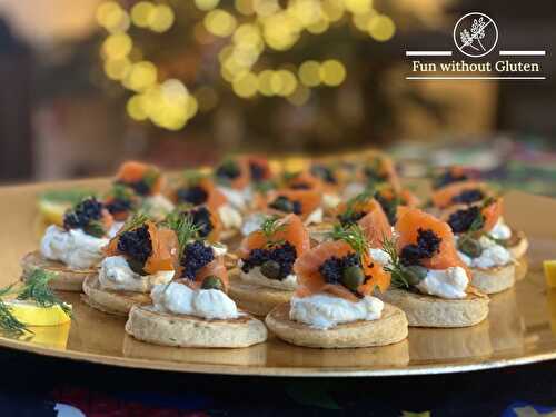 Smoked salmon with horseradish cream on top of gluten-free blinis go perfect with champagne for New Year's Eve!