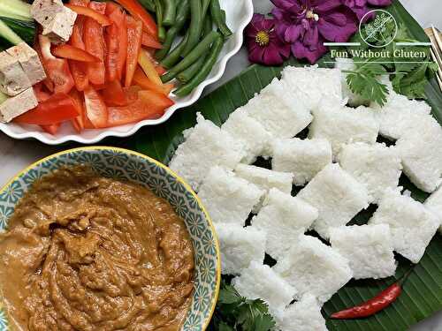 Gado Gado is a naturally gluten-free Indonesian cold salad of blanched, steamed or fresh vegetables of your choice, including hard-boiled eggs, rice cakes & tofu, served with a peanut satay sauce.