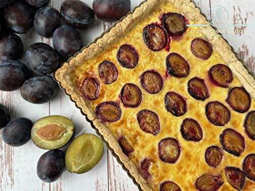This plum tart known as Zwetschgen-Wähe in German originated in Switzerland and is typically prepared as thin square slices of sweet tart filled with a custard mixture and halved or sliced plums.