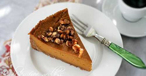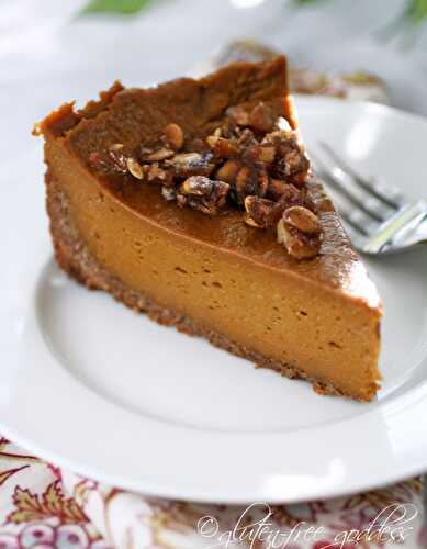 A rich, beautiful vegan pumpkin pie with gluten-free coconut-pecan crust and praline topping.