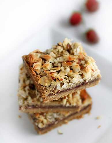 Gluten-free luscious raspberry jam cookie bars recipe with coconut and toasted almonds.