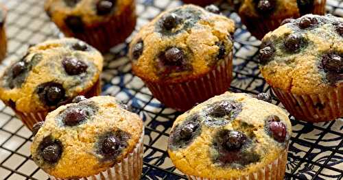 A super tasty new muffin recipe with big blueberry flavor, less sugar, and a lovely crumb thanks to the gluten-free oat bran, and touch of rice bran.