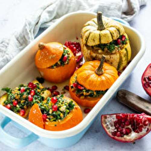 Stuffed Mini Pumpkins with kale, farro, hummus, and pistachios make a lovely single-serve vegan holiday main.
