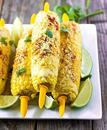 Amazing Vegan Mexican Street Corn: tender corn, slathered with creamy vegan mayo, dairy-free parmesan, lime, spicy cayenne, and cilantro.