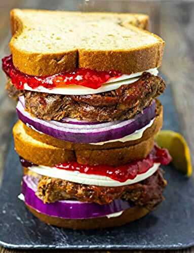 Vegan Meatloaf Sandwich, made with leftover vegan meatloaf, cranberry sauce, and vegan cheese and red onions, this is no doubt the best leftover meatloaf sandwich that is vegan and gluten-free.