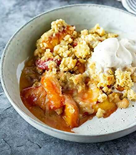 This amazing Vegan Peach Cobbler is so easy to make, loaded with fresh ripe juicy peaches and topped with a gluten-free vegan cookie batter that is crisp on the outside and so soft on the inside it melts in your mouth.