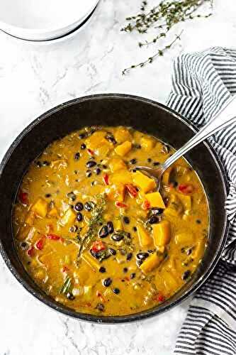 Black bean with sweet butternut squash and collard greens make this healthy stew so hearty and comforting!