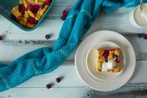 Keto berry bread pudding, baked in an orange flavored custard and filled with fresh assorted berries.