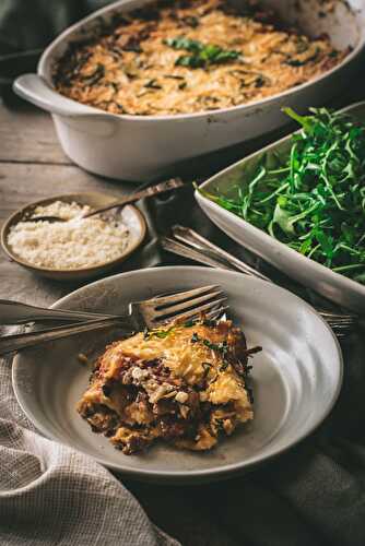 Keto spicy lasagna is made with “fathead” dough, sausage, tomatoes, cottage cheese, and topped with a blend of cheeses.