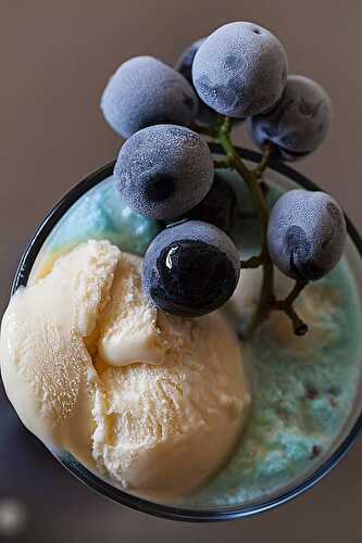 Recipe for a beautiful blue ice cream soda for adults made with fresh fruit muddled with wine coolers and ice cream.
