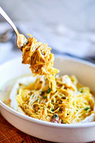 This Baked Brie Spaghetti Recipe brings together brie cheese, sun-dried tomatoes, roasted garlic, and basil.