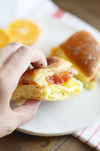 Scrambled eggs, bacon, and cheddar cheese sandwiched inside a sweet, buttery Hawaiian roll.