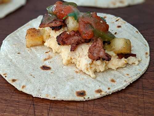 Sausage, Bacon, Scrambled Egg, Potato and Jalapenos all served on a soft tortilla and topped with spicy sauces.