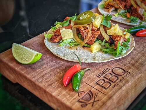 Pork marinated overnight cooked on the BBQ, on the rotisserie, resulting in succulent pork with a few charred pieces.