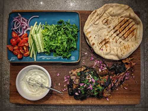Chicken Thighs marinated overnight then cooked on the BBQ, on the rotisserie and then served is a soft flatbread.