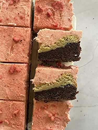 Chocolate and vanilla layered cookie bars topped with a delicate strawberry pink buttercreamdairy-free, egg-free, nut-free, soya-free, sesame-free, vegetarian and vegan