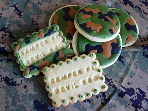In honor of the Marine Corps' birthday, I baked and decorated some camouflage cookies! The pattern looks like a cross between traditional and digital camo.