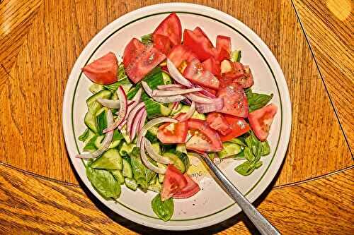 A classic cucumber and tomato salad with sliced onions, oil, vinegar and lots of fresh basil.