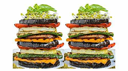 This grilled vegetable napoleon is a showstopper with vibrant, char-grilled layers of veggies like eggplant, zucchini, bell pepper, portobello mushroom, and more.