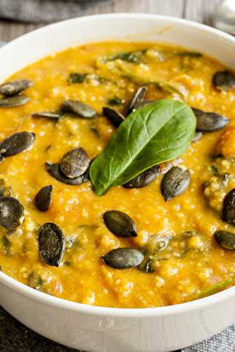 How about a rich and filling vegan sweet potato soup? It is a veggie-loaded soup with bell peppers, carrots, spinach and more.