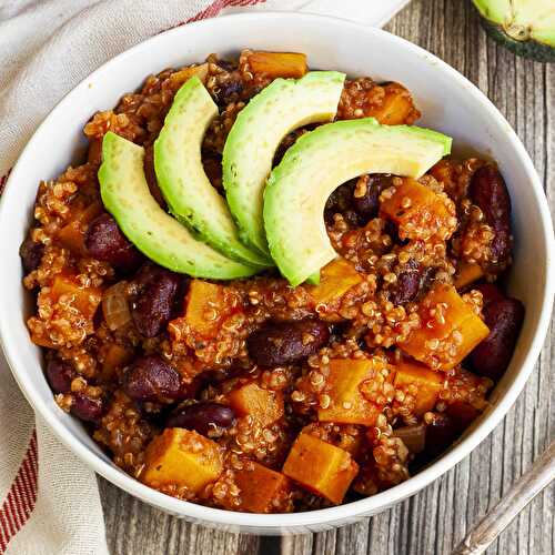 One of the many ways to enjoy a hearty, meatless chili that is ready under 30 minutes is this Quinoa Sweet Potato Chili.
