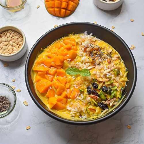 Mango Overnight Oats is a no cook easy breakfast recipe made with rolled oats, mangoes, coconut, yogurt and milk .