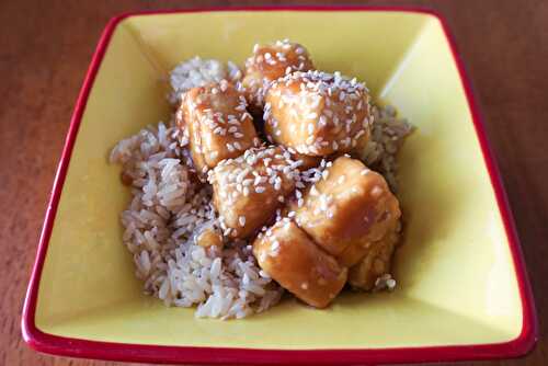 Crispy cooked tofu coated in tangy sweet orange sauce that pairs well with cooked brown rice, topped with sesame seeds and green onions.