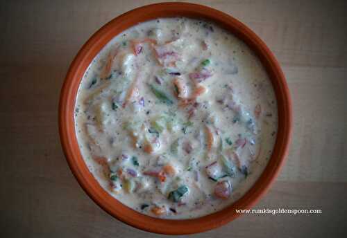 Vegetable Raita is an Indian salad dressing which is prepared by spicy whisked Yogurt.