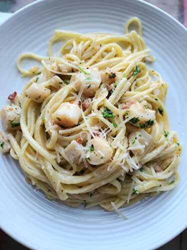 This Scallop Alfredo with Pancetta is creamy, garlicky and peppery, full of juicy scallops and smokey pancetta, topped with fresh parsley.
