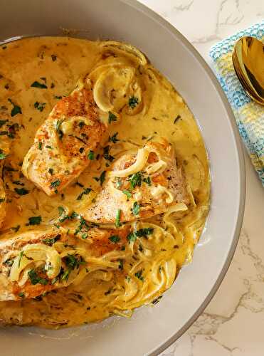 Salmon in lemon cream sauce recipe; tender and flaky salmon fillets covered in a rich, tangy and fragrant creamy sauce, ready in 25 mins