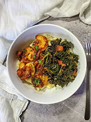This Shrimp and Grits with Sautéed Kale is made of tasty shrimp with bacon & kale sautéed with onions and tomatoes over creamy cheesy grits.