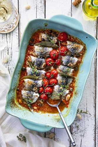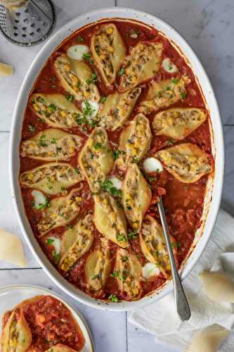 Pasta shells filled with tuna, corn and mascarpone in a spicy tomato sauce with pointed pepper.