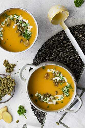Pumpkin soup with a sweet velvety taste, the spicy touch of ginger and crispy baked pumpkin seeds.