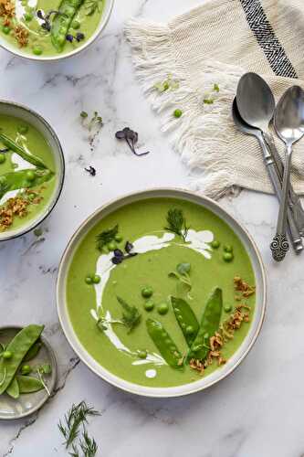 The tastiest and simplest recipe of fine pea soup with crispy snow peas