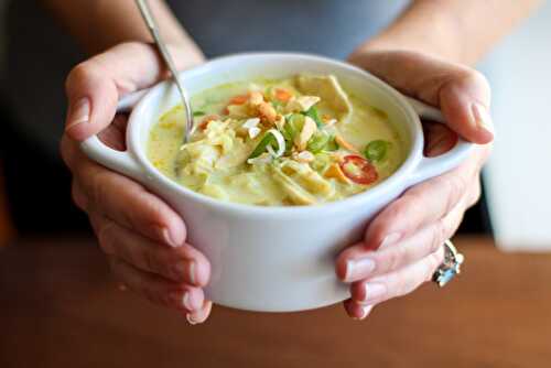 This Mulligatawny soup has a deliciously creamy base with warm, earthy curry powder, sweet carrots, tart apple, and tender shredded chicken.