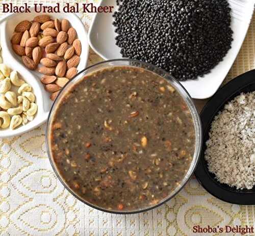Black urad dal kheer prepared with just four ingredients like whole black urid dal with skin, jaggery, grated coconut and milk.
