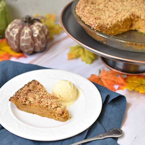 This crustless pumpkin pie is super easy to make and so yummy! The sweetened condensed milk and the tasty crunchy topping take this pie to a whole new level of deliciousness!