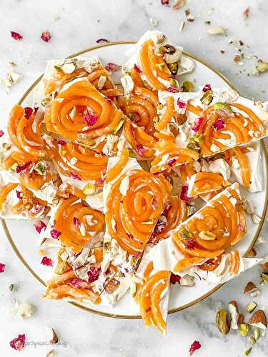 A fun Indian twist on white chocolate bark with bright Jalebi spirals, mixed nuts and edible florals