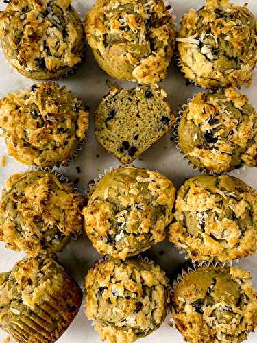 Matcha blueberry muffins with a toasted coconut topping are quick muffin mix hack that is amazing and easy! Main ingredients: muffin mix and matcha powder but don't forget that toasted coconut topping!