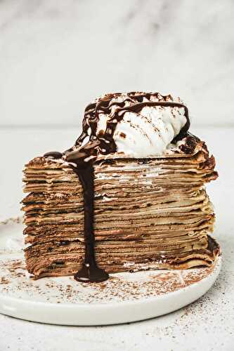 Chocolate crepe cake made with about 20 small crepes of 6 inch / 15 cm in diameter filled with a chocolate mascarpone whipped cream.