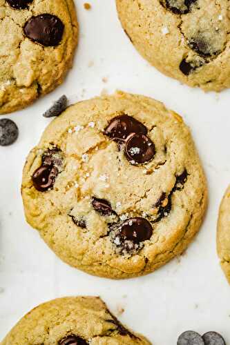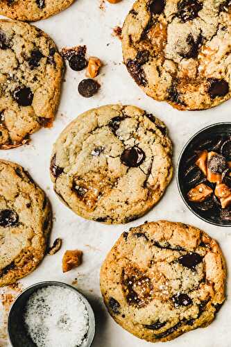 Recipe for salted caramel chocolate chip cookies, soft and chewy with chocolate chips (for 12 to 14 cookies)