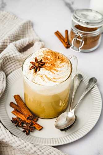 Delicious homemade healthy pumpkin spice latte recipe with homemade pumpkin puree, hot spices, espresso coffee and almond milk (for 1 cup)