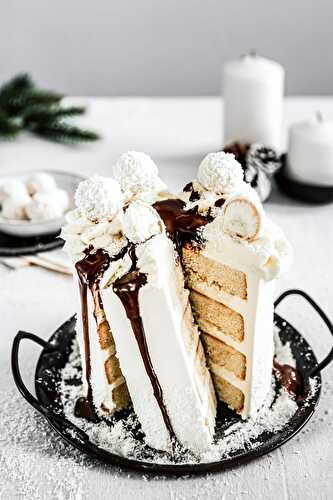 Coconut Raffello layer cake, a sponge cake, a coconut white chocolate whipped ganache, a Swiss meringue buttercream (for a 12 cm layer cake 8-10 parts)