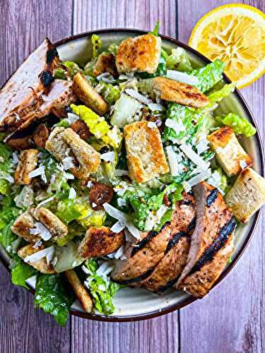 A staple recipe in your household should be this chicken Caesar salad! Juicy grilled or baked chicken, garlicky Caesar dressing, lots of parmesan cheese, and crazy good homemade croutons: it’s seriously the best.