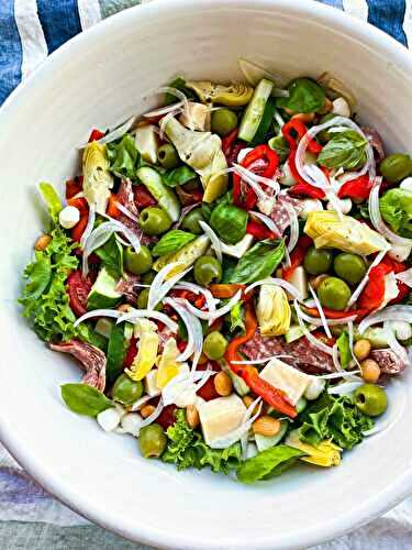 Everything you want on an Italian antipasto platter is tossed into a salad with greens and a zesty homemade vinaigrette.