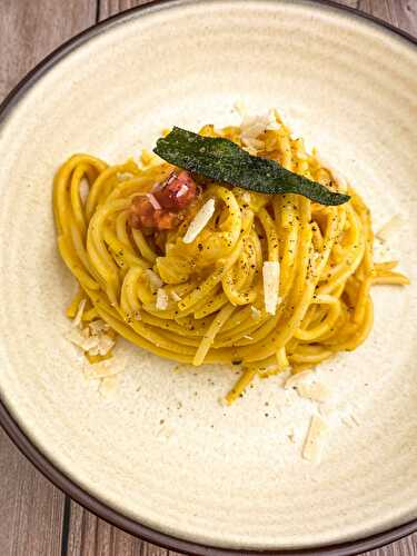 It’s time for my first pumpkin recipe of the season: Pumpkin Carbonara with Crispy Fried Sage.