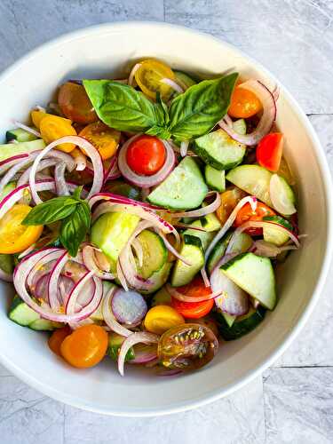 This simple tomato-cucumber salad recipe is one of my favorite late summer side dishes.