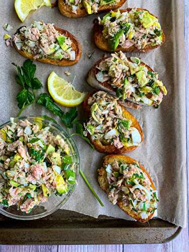 This easy tuna avocado salad served like bruschetta on top of toasted ciabatta is pretty much a dream! Recipe by Grace Vallo