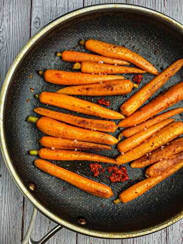 Spicy vegetable side dish: harissa pan roasted carrots are easy to make and so versatile! Recipe by Grace Vallo.